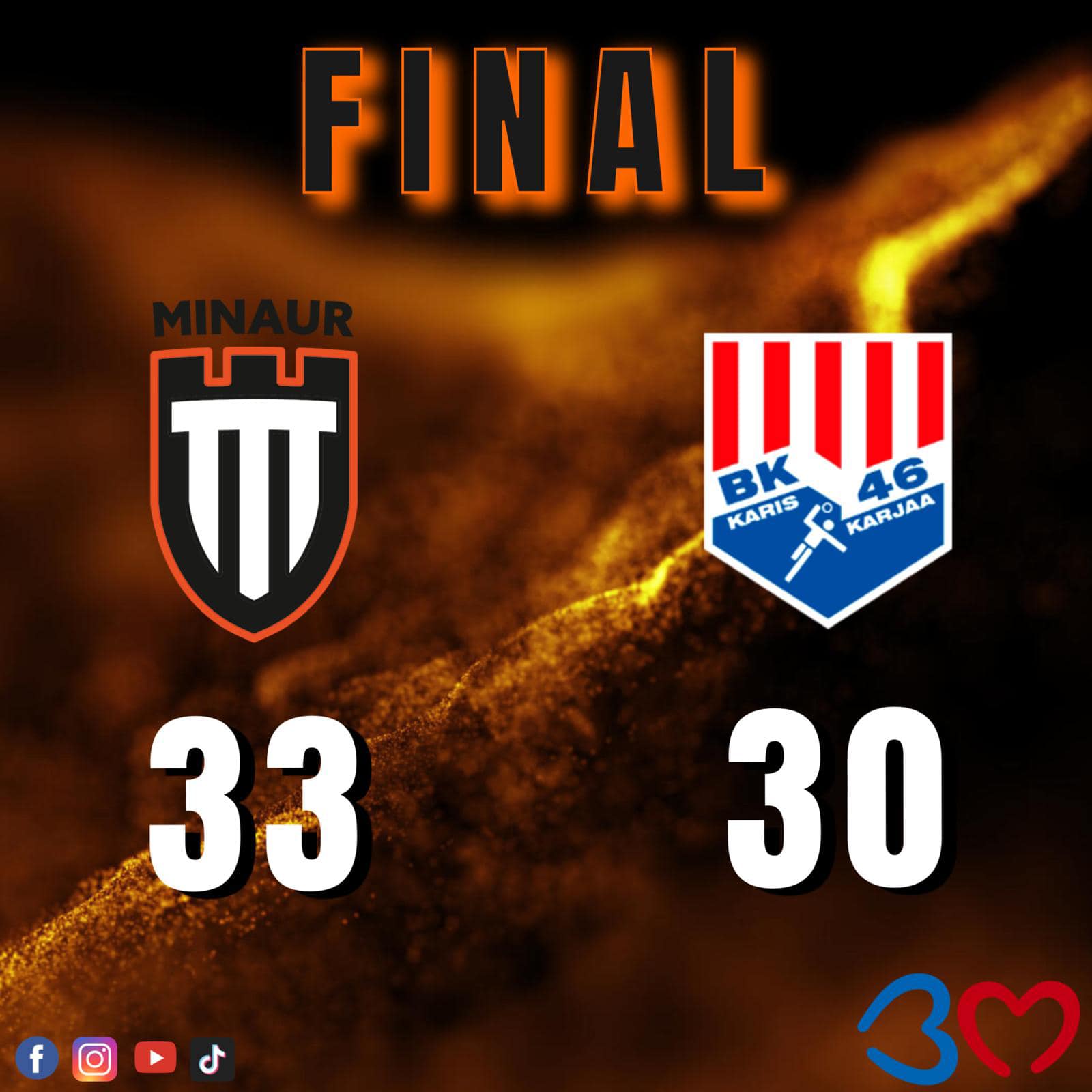 Minaur punctează prima și în partea a doua, apoi se înscrie de ambele părți și e 17-22 (min. 35), 17-23 (36). Minaur nu cedează și înscrie trei goluri consecutiv: 20-23 (38). Imediat a venit replica nordicilor, care izbutesc și ei o triplă: 20-26 (41). Din nou time-out și se simte: 25-27 (46), Sabou luând decizia să joace în mai multe rânduri fără portar și un jucător în plus pe teren. În min. 48 se face 26-27 și antrenorul gazdelor cere timp de odihnă. Avem șansa de a egala și o facem din aruncare de la 7m: 27-27. Ținem aproape și e 29 egal cu șapte minute înaintea ultimului fluier. Gazdele ratează primul și singurul lor 7m din acest meci, dar înscriu pe contraatac la faza următoare. Cinci minute și e 30-30. Jucăm din nou cu “om în plus” și înscriem prin Burzak, 31-30, ba chiar avem șansa să mergem la două goluri. Gazdele ratează din nou și Minaur înscrie prin Kotrc: 32-30. Ținem de rezultat, iar în ultimul minut cerem și time-out. Mai vine un gol de la Botea și Minaur se impune 33-30. 20 de minute în care am trecut de la minus 6 la plus 3. Speranțe mari de calificare în sferturile de finală. Maxime felicitări!